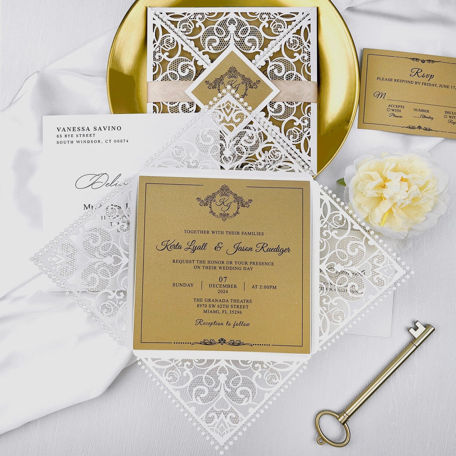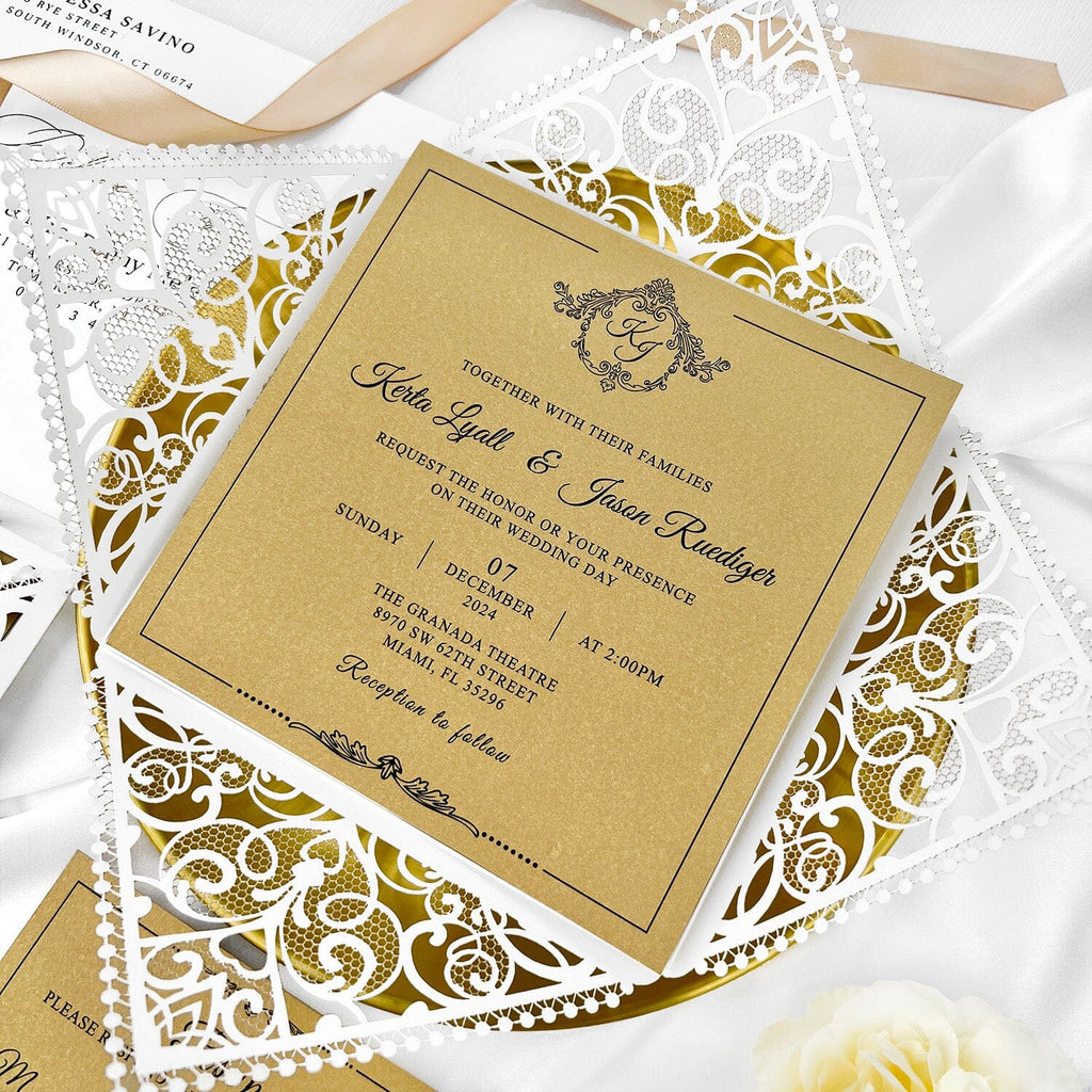 Source : www.instagram.comLaser Cut White and Gold Wedding Invitations, Square Floral Lace Weddi