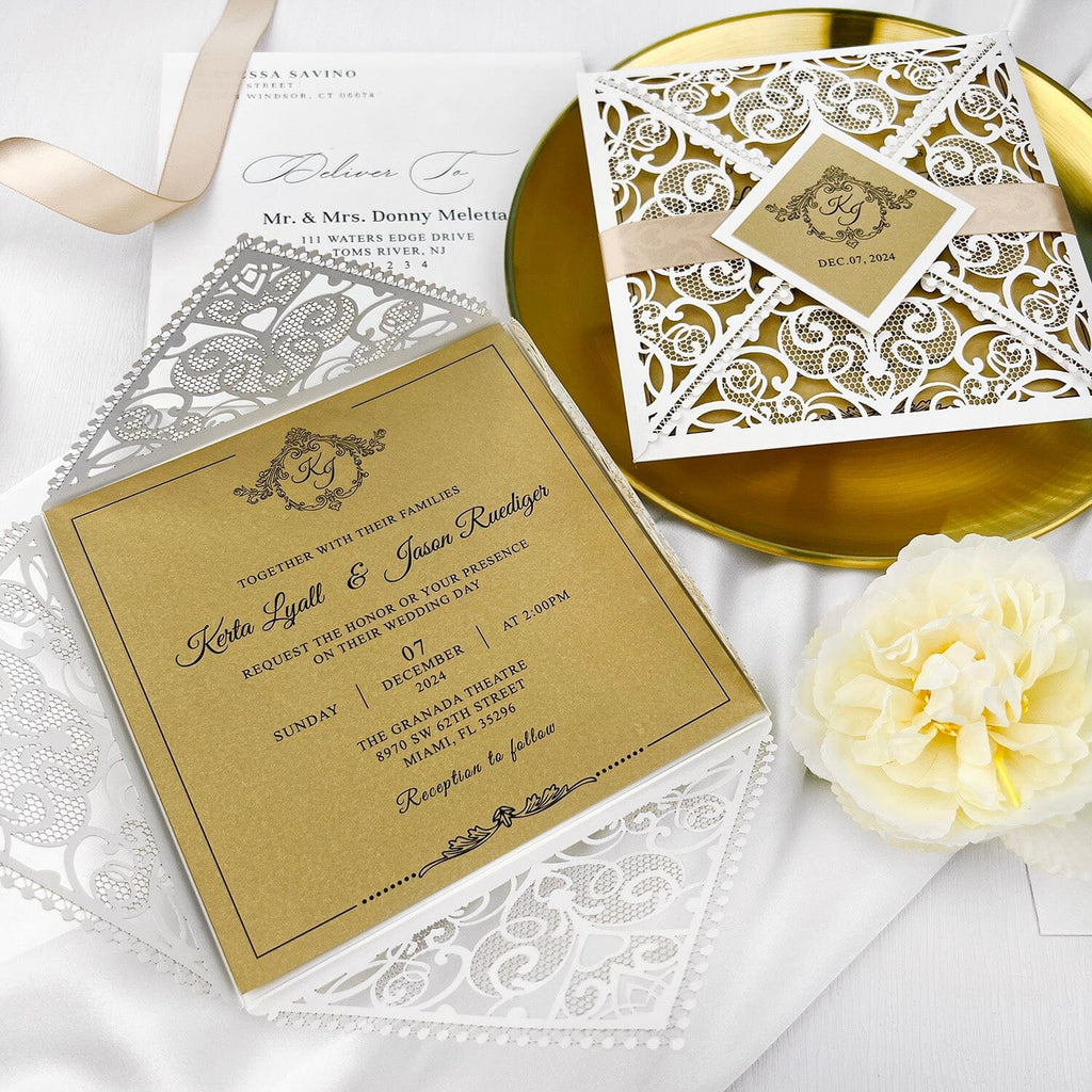 Source : www.facebook.comLaser Cut White and Gold Wedding Invitations, Square Floral Lace Weddi